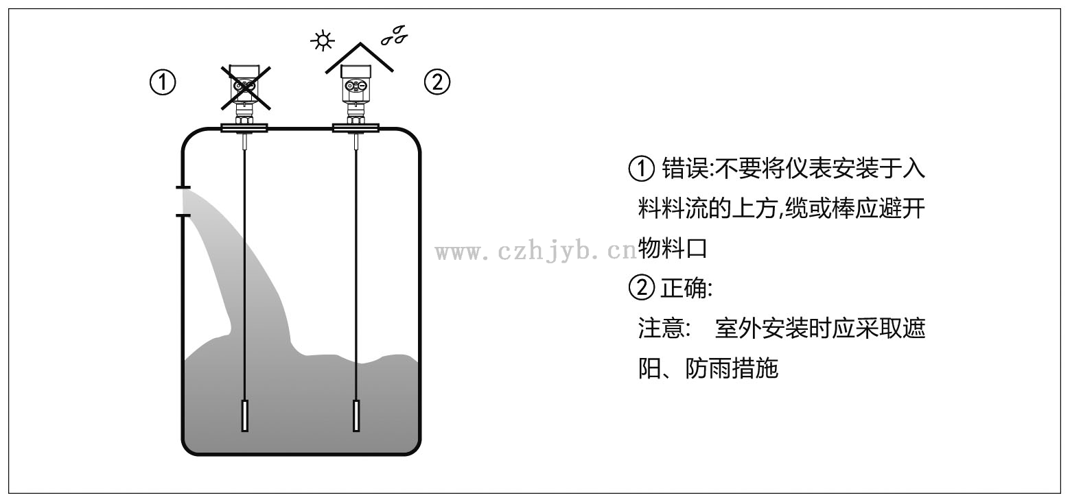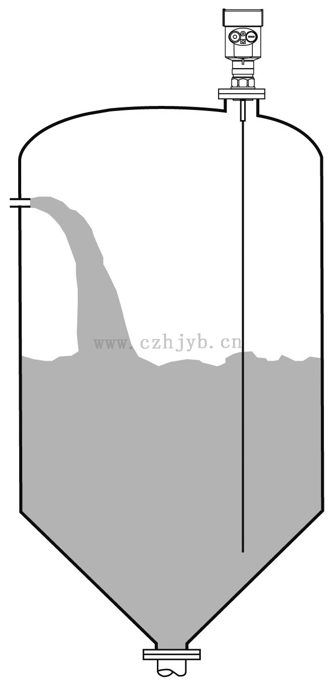 在整個量程范圍內(nèi)確定纜或棒不要接觸到內(nèi)部障礙物,因此安裝時應(yīng)盡可能避開罐內(nèi)設(shè)施,如:人梯、限位開關(guān)、加熱設(shè)備、支架等。另外需注意纜或棒不得與加料料流相交。