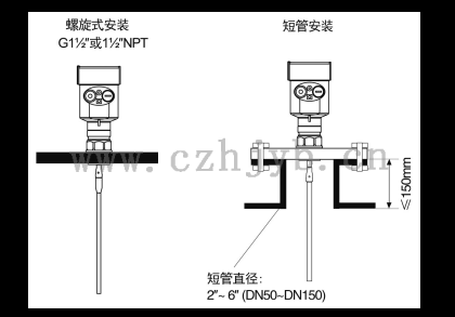 導(dǎo)波雷達(dá)物位計可采用螺紋連接,螺紋的長度不要超過15mm,還可以采用在短管上安裝。安裝短管直徑在2″至6″則安裝短管高度應(yīng)≤100mm(螺紋及短管的長度越短,測量越穩(wěn)定),若安裝短管較長,理想狀態(tài)應(yīng)將短管割短,或底部固定纜式探頭及選用絕緣對中支架以避免纜式探頭與短管末端接觸。