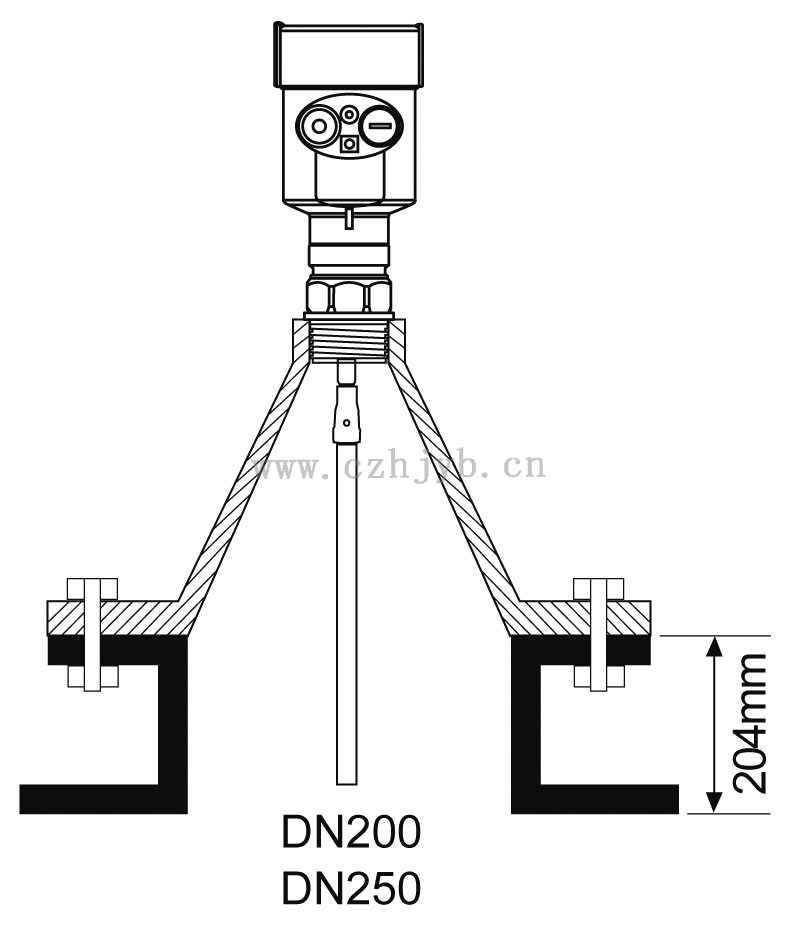 當(dāng)導(dǎo)波雷達(dá)需要安裝于直徑大于200mm短管時,短管內(nèi)壁產(chǎn)生回波,在介質(zhì)介電常數(shù)低的情況下會引起測量誤差。因此,對于一個直徑為200mm或250mm的短管,需要選一個帶“喇叭接口”的特殊法蘭。