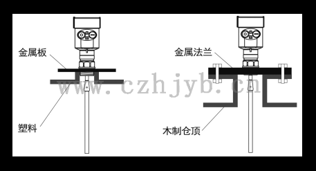 無論是纜式或桿式,若想導(dǎo)波雷達(dá)工作正常,過程連接表面應(yīng)為金屬。當(dāng)導(dǎo)波雷達(dá)裝在塑料罐上時,若罐頂也是塑料或其它非導(dǎo)電材質(zhì)時,儀表需要配金屬法蘭,若采用螺紋連接,需配一塊金屬板。