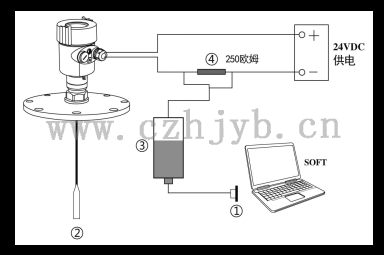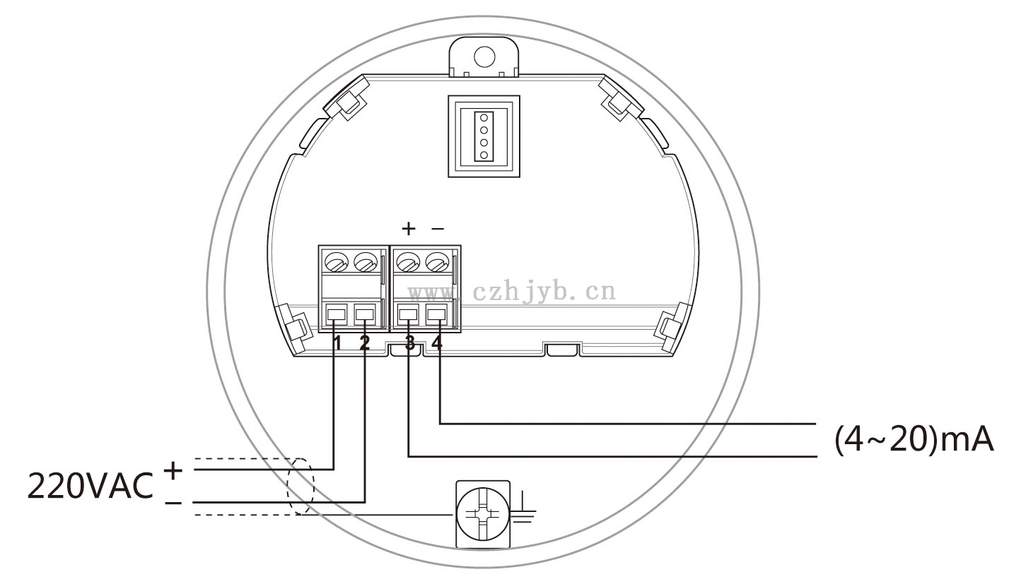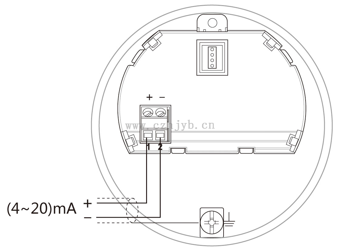 (4~20) mA/HART(兩線制) 供電電源和輸出電流信號共用一根兩芯屏蔽電纜線。具體供電電壓范圍參見技術(shù)數(shù)據(jù)。對于本安型須在供電電源與儀表之間加一個安全柵。