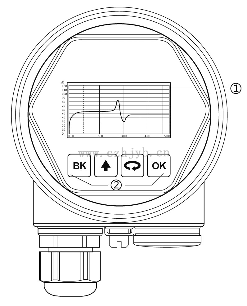 在進(jìn)入電氣接口前,將電纜向下彎曲,以確保水不會流入殼體,見①