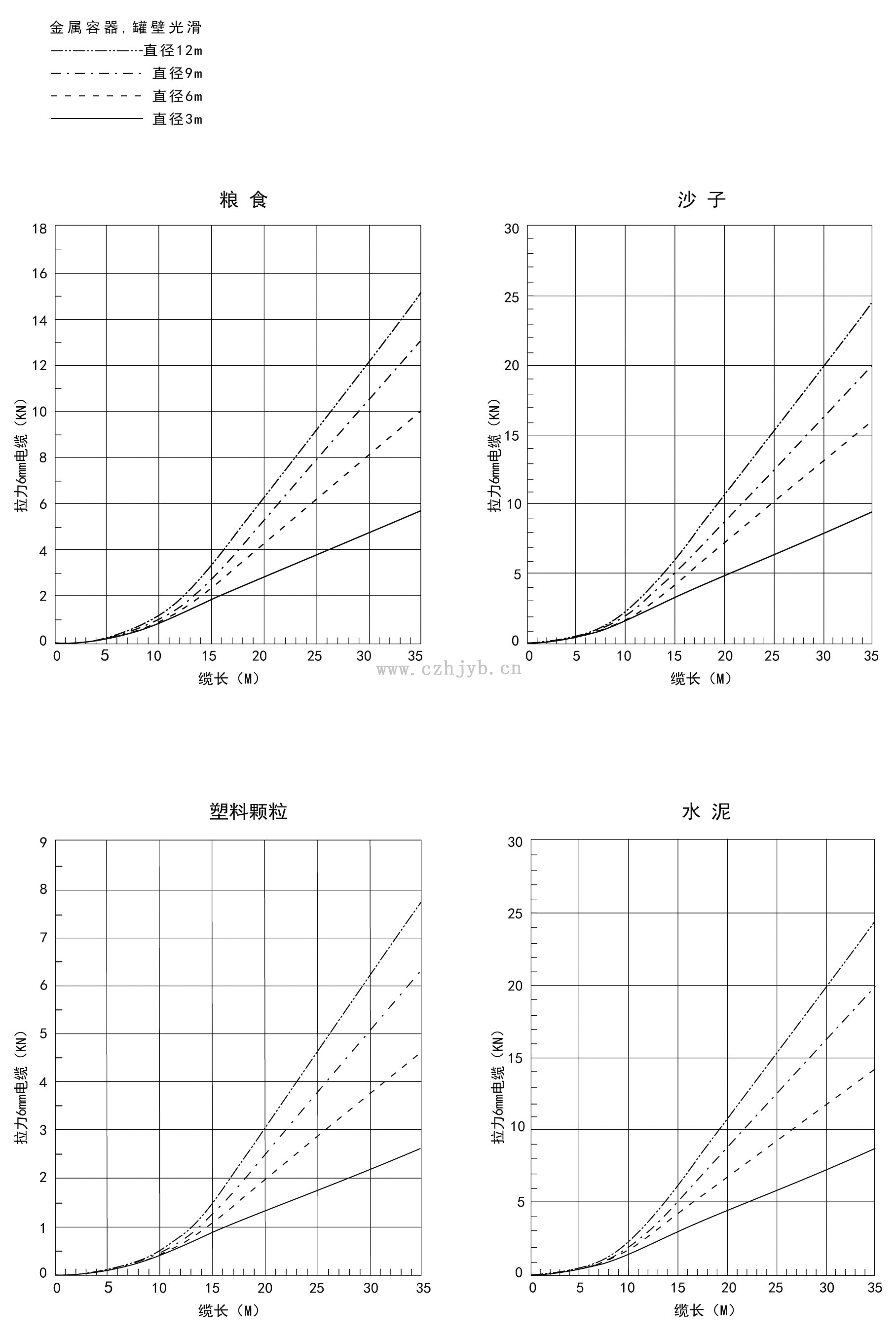 在測量固體介質(zhì)的時候,拉力取決于容器直徑和物位,以下顯示的是一些典型介質(zhì)產(chǎn)生的拉力。