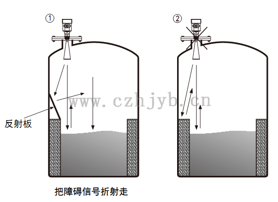 Ø 當(dāng)罐中有障礙物影響測量時,要加裝反射板才能正常測量。